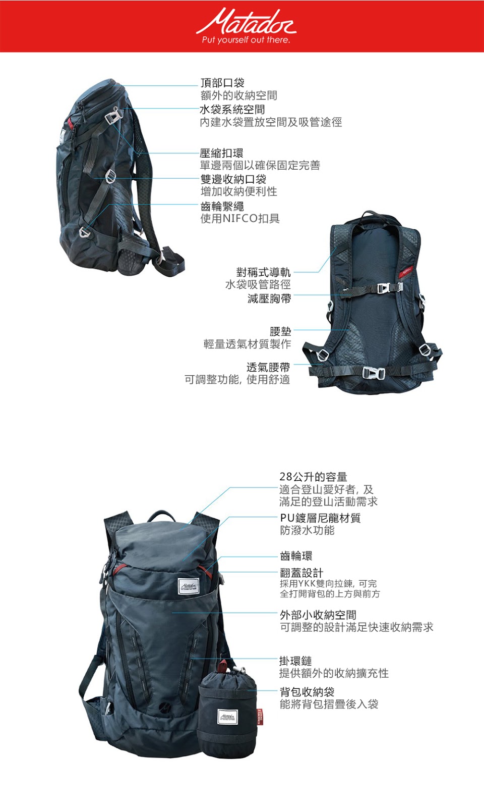 Matador Beast28以頂級材質Codura ripstop防水聚氨酯塗層為面料,具質輕、強韌、耐磨、抗刮、耐操、防水等優點,非常適合遠距離的冒險和徒步旅行。